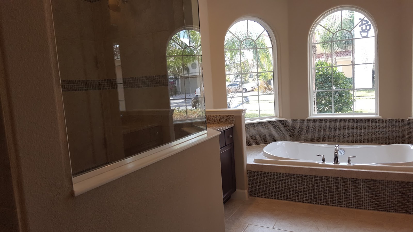 팜트리 사이로 골프 코스가 내다 보이는 뒷뜰과 그 사이 산책로 보이시죠?