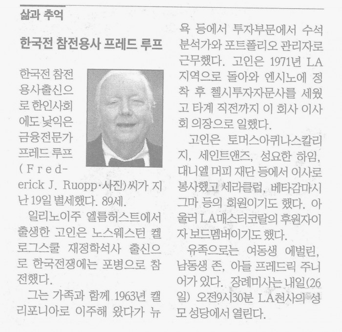 금융 전문가/한국戰 참전 용사 포병 출신