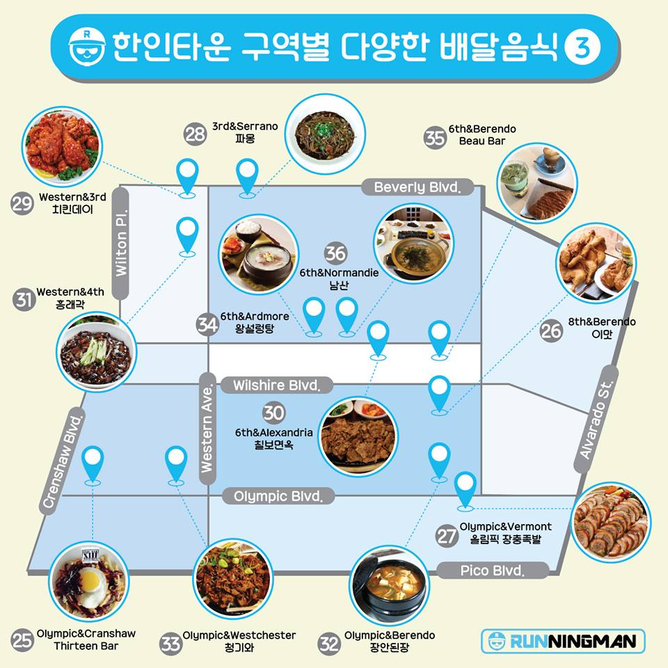 우리가 자주 시켜먹는 배달음식의 식당이 어디인지 궁금하셨던분들 모두 주목!런닝맨이 소개하는 한인타운 구역별 배달음식 지도입니다.우리집 근처엔 무슨식당이 있었나?궁금하셨던 분들한테도 딱!오늘은 직접 근처 식당에 방문하셔서 드셔보세요~물론,배달음식도 맛있지만, 직접 가서 드시면 더 맛있답니다!
