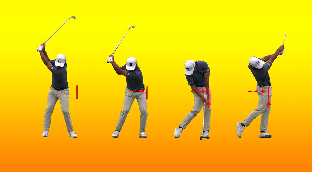 다운스윙때 지금처럼 왼쪽으로 이동하는 동작은 LATERAL MOVEMENT 라고 표현하며 다운스윙때 필요한 동작입니다.)