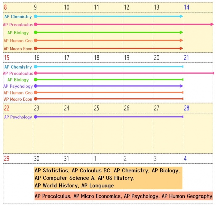 AP US History, AP World History, AP Language, AP Calculus AB/BC, AP Precalculus, AP Chemistry, AP Environmental Science, AP Biology, AP Psychology, AP Statistics, AP Micro/Macro Economics, AP Physics 1 + C, AP Human Geography, AP Music Theory