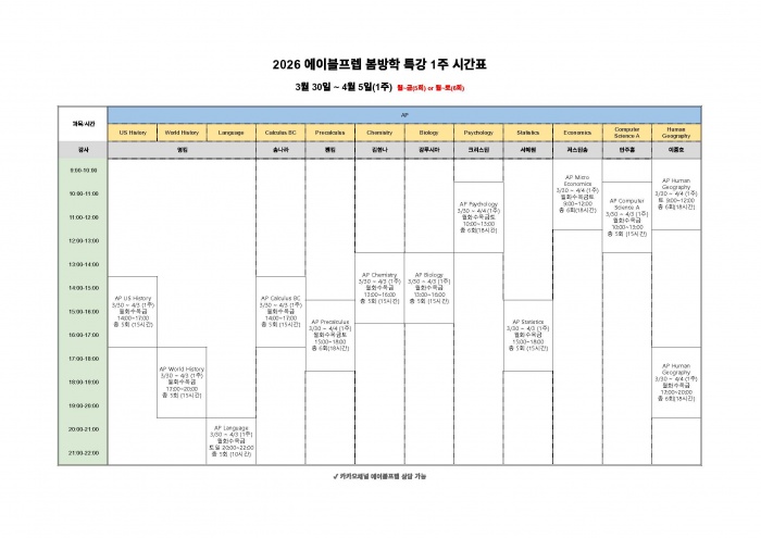 2026 AP 대비, 실전! 문제풀이반 시간표(주말) 확인해보세요.