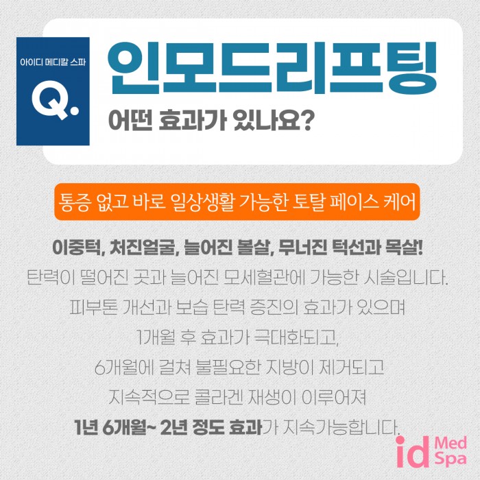 한번의 시술로 3가지 효과 토탈 페이스 케어 인모드 리프팅 2022.03.18 - 인모드 리프팅은 한번의 시술로 SMAS층gt진피층gt표피층을 순차적으로 세 번 당겨주는 토탈 페이스 리프팅입니다. 이중턱 처진얼굴 늘어진 볼살 무너진 턱선과 목살 탄력이 떨어진 곳과 늘어진 모세혈관에 가능한 시술입니다.피부…