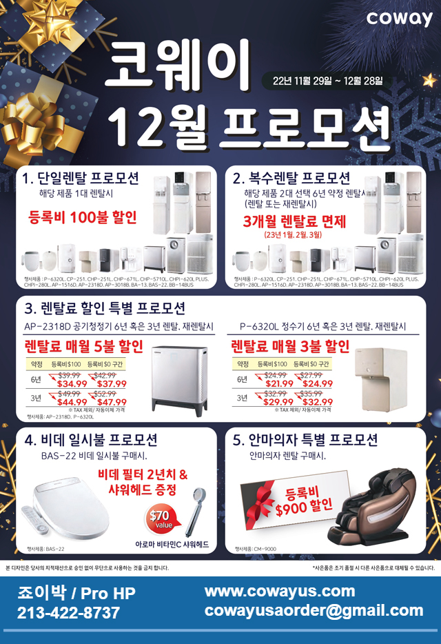 COWAY-11월332상당 온열매트 증정-정수기 공기청정기 비데 연수기 2024.11.11 - Pro HP : 죠이 박(213) 422-8737(LA / 미전지역)(714) 576-4144 (orange county)웹사이트 :http://www.cowayus.com 11월 코웨이/COWAY 대고객 할인…
