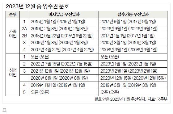 국무부 12월 비자 블러틴 발표가족middot취업 발급middot접수일자 lsquo그대로rsquo11월에 이어 12월에도 영주권 문호가 전면 동결됐다.국무부가 9일 발표한 2023년 12월 비자 블러틴에 따르면 가족이민과 …