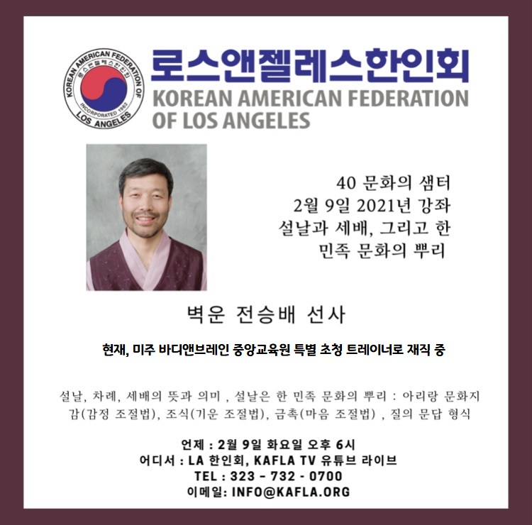 문화의 샘터 한민족 문화의 뿌리 2021.02.08 - 신문기사 클릭 http://www.koreadaily.com/news/read.aspart_id9071654LA 한인회 유튜브https://www.youtube.com/channel/UC0eC11Hw5AYxaZkfcwPdm…