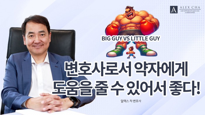 안녕하세요. 알렉스 차 변호사입니다.변호사 활동을 하면서 가장 만족스러워 하는 부분은 바로 사람을 도울 수 있다는 점입니다. 교통사고 분야와 레몬법 분야에서 피해자는 상대적으로 약자일 수 밖에 없습니다. 마치 다윗과 골리앗…