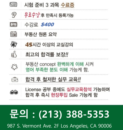 부동산 학교 라이센스2023.09.28- 부동산 업계에서의 성공을 꿈꾸고 있다면 엘에이 부동산 학교에서 교육을 받고 라이센스를 취득하세요. 더 많은 정보를 얻으려면 지금 연락처를 통해 질문을 하실 수 있습니다. 부동산의 세계로의 첫걸음을 떼기 위해 우리와 함께하세…
