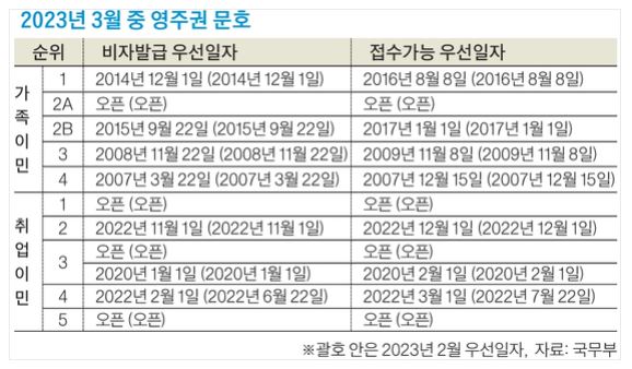 취업이민 4순위 종교이민 4개월 반 후퇴 2023.02.21 - 취업이민 4순위 영주권 문호가 대폭 후퇴해 영주권 발급 적체가 심화될 전망이다.국무부가 15일 발표한 2023년 3월 중 영주권 문호에 따르면 취업이민 4순위(종교이민) 부문 비자발급 우선일자가 전달보다 4개월 3주 후퇴한…