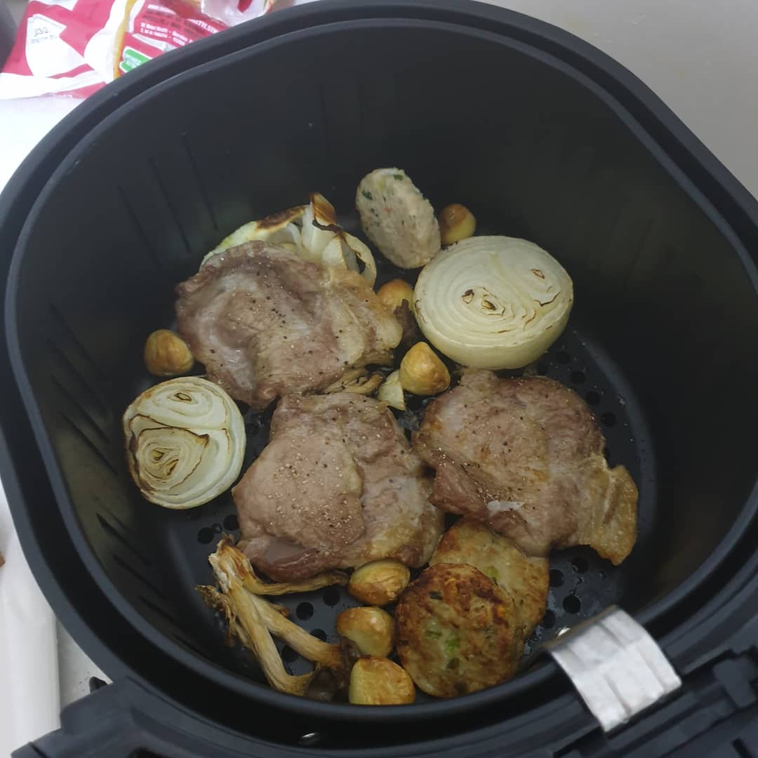 안녕하세요 에어프라이어를 구입했는데요요즘 요리의 신세계를 경험하고 있습니다음...세로로 찍은 사진인데 가로로 올라가네용 음...제가 목살을 사서 마늘과 양파를 에어프라이어에 넣고180도에 15분 뒤집어서 15분 한 요리에요…