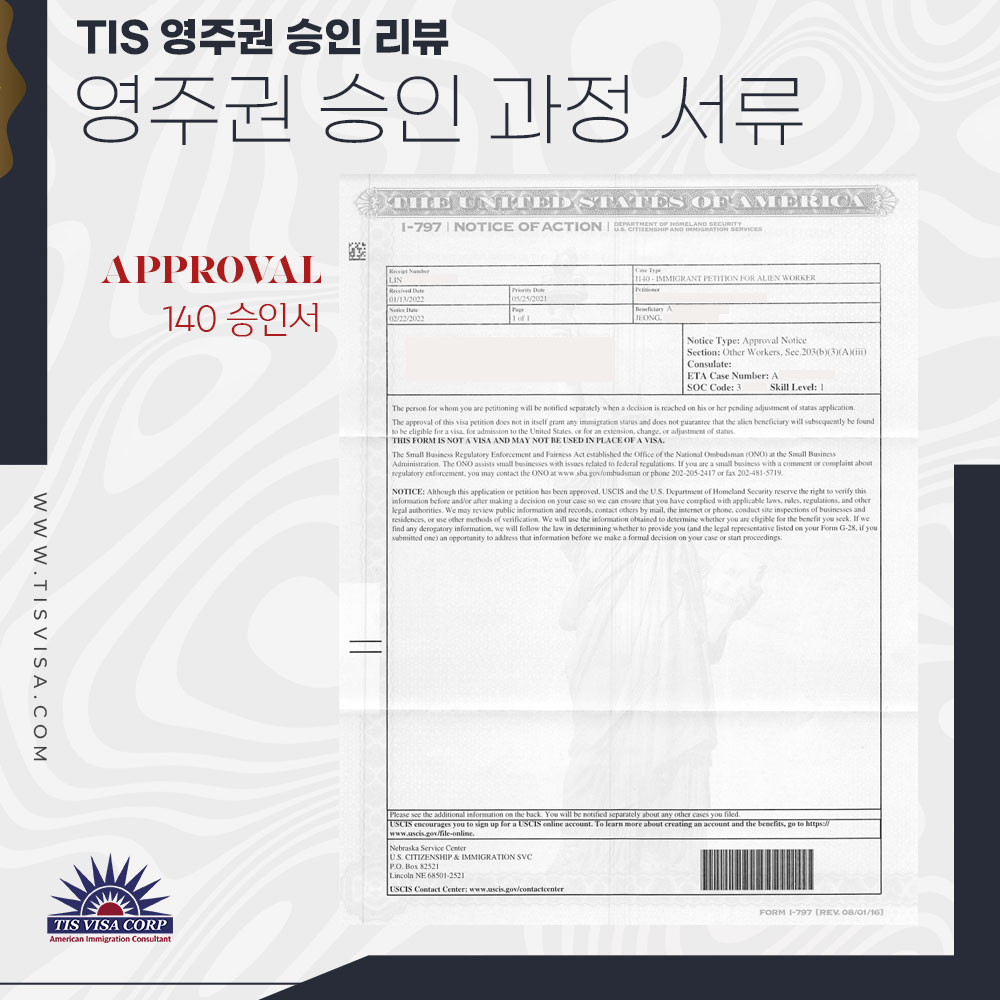 정 님 미국 이민 청원서 I-140 승인 안내 2022.02.28 - 정 님 140 이민 청원서 승인 축하드립니다이민 청원서를 일반 접수로 진행한 뒤 급행으로 변경하고 조금 더 승인이 빠르게 이루어졌습니다.- 2022년 2월 22일 이민 청원서 승인남은 과정도 기분좋게 마무리될 수 있도록 끝…