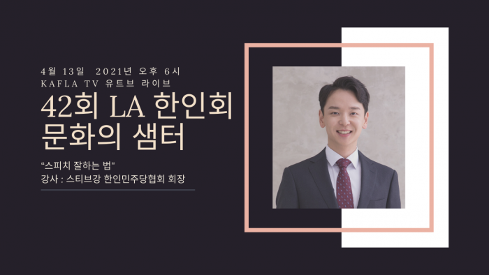 151. LA 한인회 문화의 샘터 를 아시나요 2021.04.12 - ldquo LA 한인회 문화의 샘터에서 알려드립니다. 42회 문화의 샘터는 4월 13일 화요일 6시 스티브 강 한인민주당협회 회장의 ldquo스피치 잘하는 법rdquo ( Public Speaking ) KAFLA - TV…