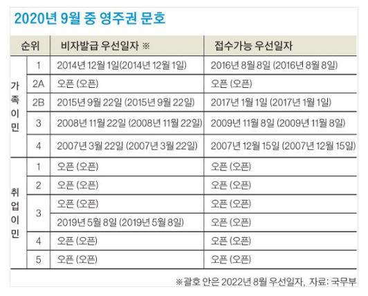 2022년 9월 영주권 문호 2022.08.15 - 가족이민 문호가 사실상 1년째 전면 동결됐다. 연방 국무부가 발표한 2022년 9월 영주권 문호에 따르면 가족이민의 영주권 승인 판정일(Final Action Date)은 오픈 상태를 유지하고 있는 영주권자 배우자 및 미성…