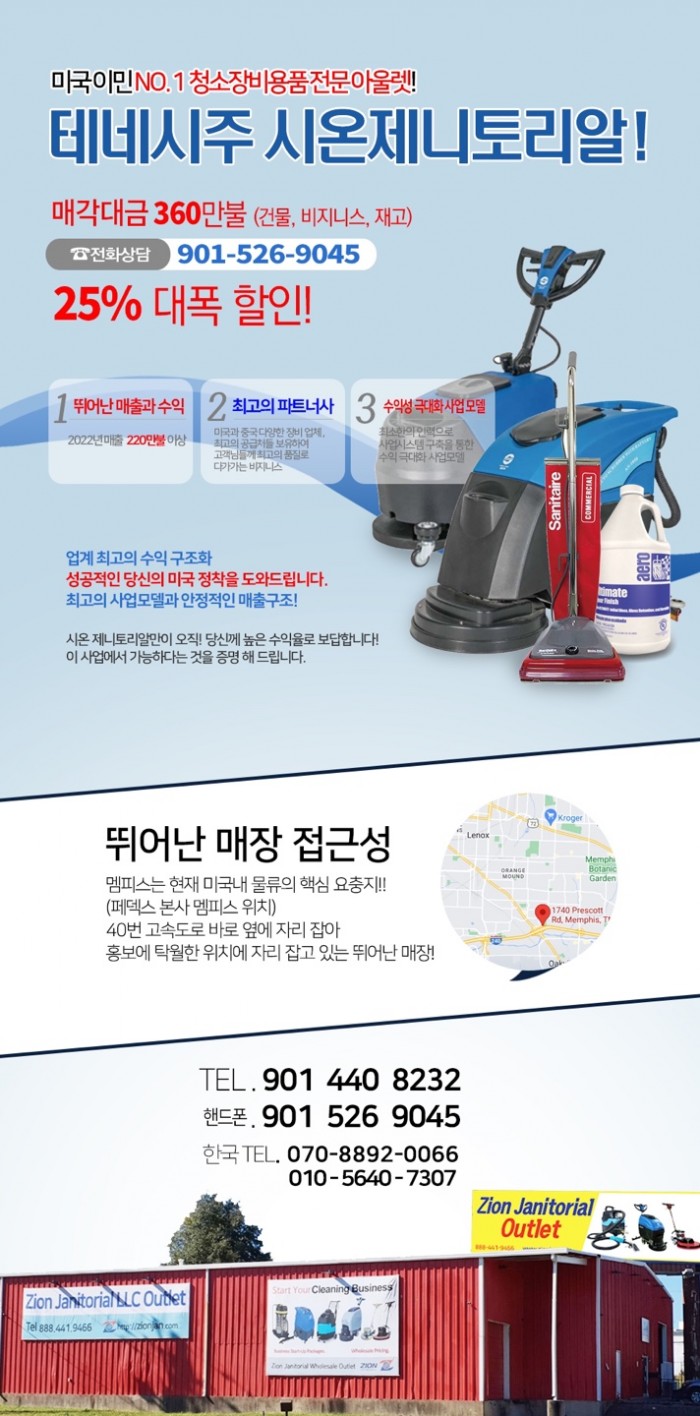 미국 테네시주 멤피스에 위치한 성업중인 청소장비 용품 비지니스 개인적인 사유로 판매합니다.관심있으신분들은 언제든지 연락주세요. 이메일:ethanchoekr@gmail.com전화 : (미국) 901-526-9045 (한국)0…